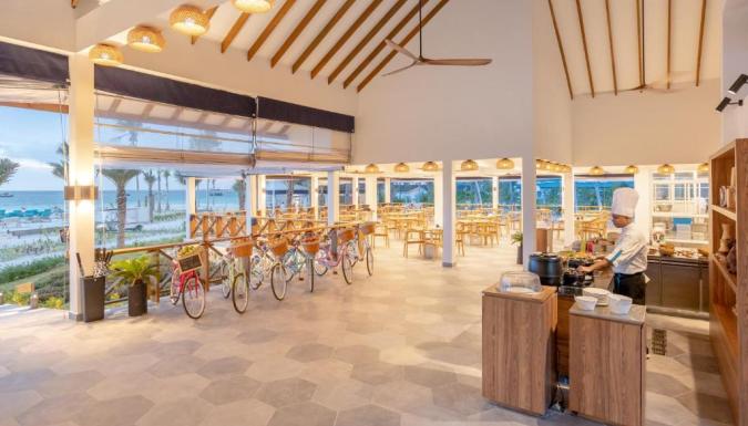 Ежедневно гостям предлагается завтрак «шведский стол», континентальный завтрак или полный английский/ирландский завтрак. При Joy Island Maldives All Inclusive Resort работает ресторан, где подают блюда американской кухни, блюда итальянской кухни и блюда средиземноморской кухни. По запросу для гостей приготовят вегетарианские, халяльные и веганские блюда.