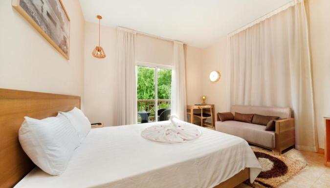 12 Family Room (55 м?, макс. 2+2 реб до 12 лет). Более просторные номера для размещения семей с детьми. Главная спальня с двуспальной кроватью и детская зона с двумя раздельными односпальными кроватями. Телевизор. Ванная комната с душем, балкон или терраса.