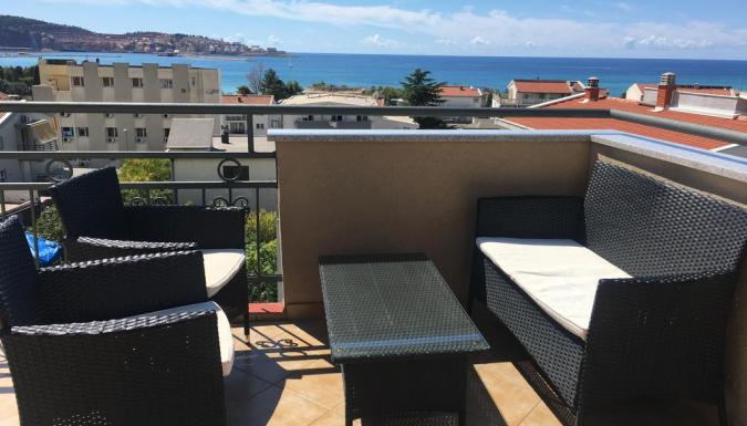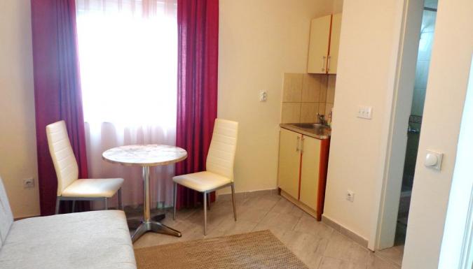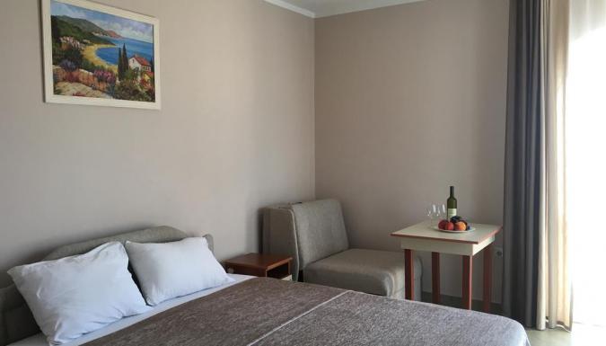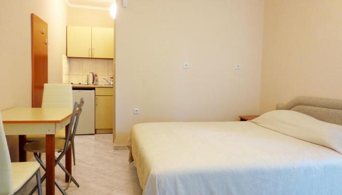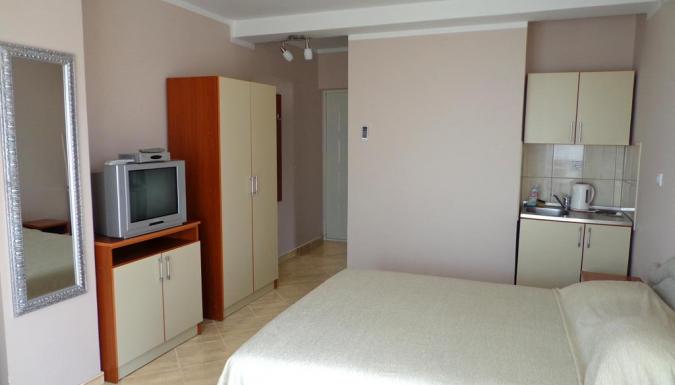 - Studio 02+1 с видом на море SV: номер рассчитан на проживание до 3 человек, с номера открывается красивый вид на море. В номере: двухспальная кровать, кресло-кровать, спутниковое ТВ (русскоязычные каналы), мини-кухня с набором посуды, мини-плита, мини-холодильник, чайник, балкон. Ванная комната: душ, туалет.