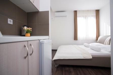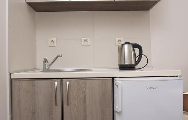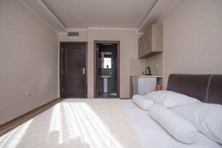 Studio 02: 20м2, французская кровать, мини-кухня, ванная комната с душем. Нет балкона.