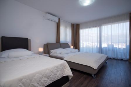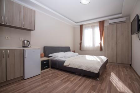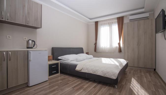 Studio 02+1: 30м2 + терраса, французская кровать и угловой раскладной диван, мини-кухня, душевая кабина.