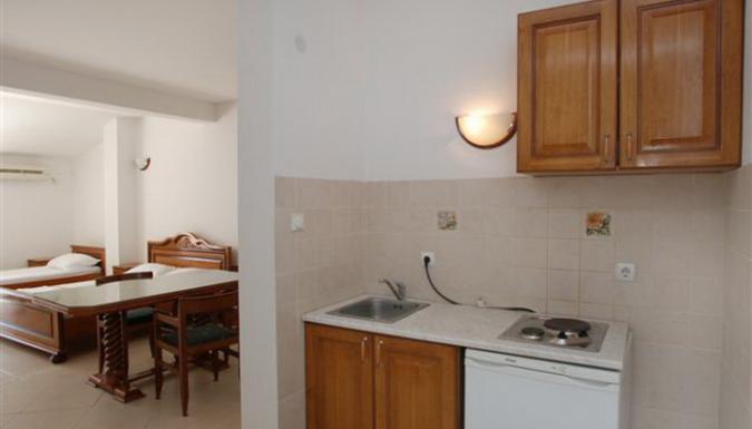 Студио 03 – около 30 кв.м. , терраса 7 кв. м. , отдельная кухня, французская и дополнительная кровать, душ/туалет, балкон, кондиционер.