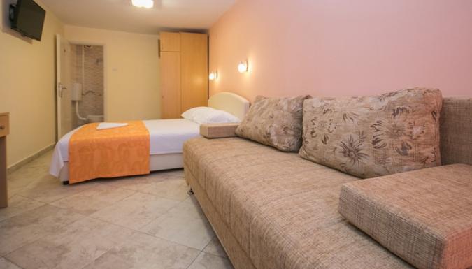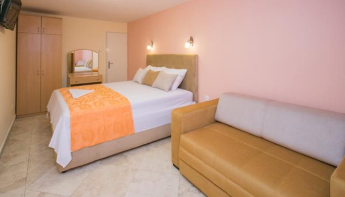 DBL+ ex.bed/SV: французская кровать, раскладной диван, балкон с видом на море, кондиционер, ванная комната.