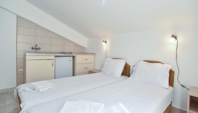 №5 App 03: 20м2 + терраса 3м2 с видом на улицу, гостиная с мини-кухней и две отдельные кровати, спальня с одноместной кроватью.