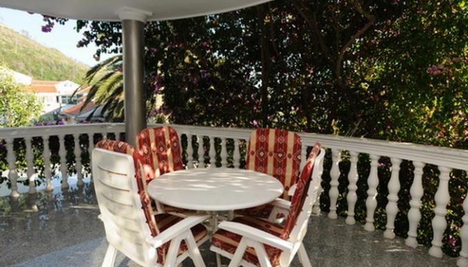 3 Studio 02 (общая большая терраса на три Studio с видом на сад и стульями, французская кровать, мини-кухня, oобеденный стол, душевая кабина)
