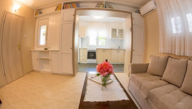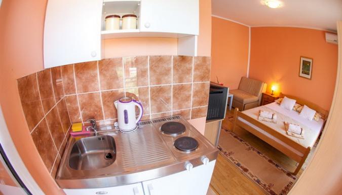 Двухкомнатный апартамент (3-5 человек) - в одной комнате - двуспальная кровать и двухэтажная кровать, во второй - одноместный диван, кухонный уголок