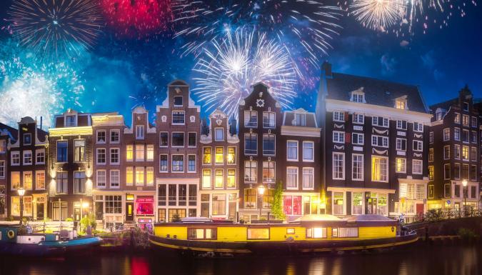 В канун праздника Амстердам превращается в карнавал огней и веселья: площади и каналы сияют иллюминацией, улицы наполняются музыкой, а небо озаряется фейерверками, отражающимися в каналах.