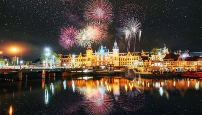 В канун праздника Амстердам превращается в карнавал огней и веселья: площади и каналы сияют иллюминацией, улицы наполняются музыкой, а небо озаряется фейерверками, отражающимися в каналах