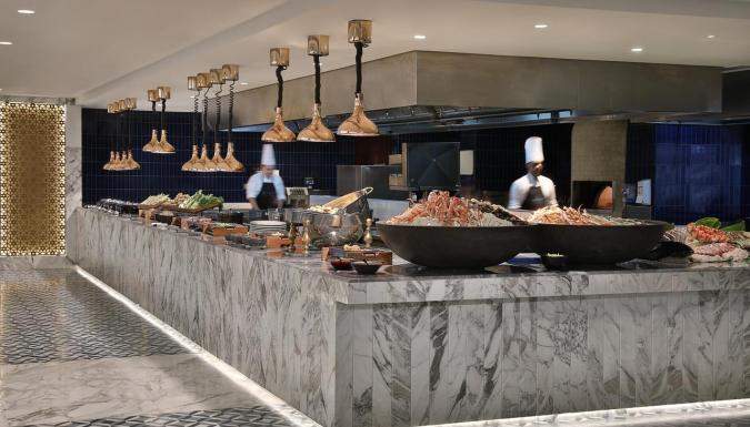 В отеле Al Bustan Palace работают 3 ресторана, где подают разнообразные блюда интернациональной кухни. В ресторане Al Khiran Terrace с видом на пейзажный бассейн и Оманскую затоку трапезу накрывают в течение всего дня. В элегантном ресторане Beach Pavilion на пляже готовят самую свежую рыбу и морепродукты. В изысканной обстановке превосходного комфортабельного ресторана China Mood сервируют традиционные блюда китайской кухни. Гости также могут отдохнуть и выпить коктейль в баре BLU возле бассейна или заказать эксклюзивный ароматный чай в фешенебельном чайном лаундже The Atrium.