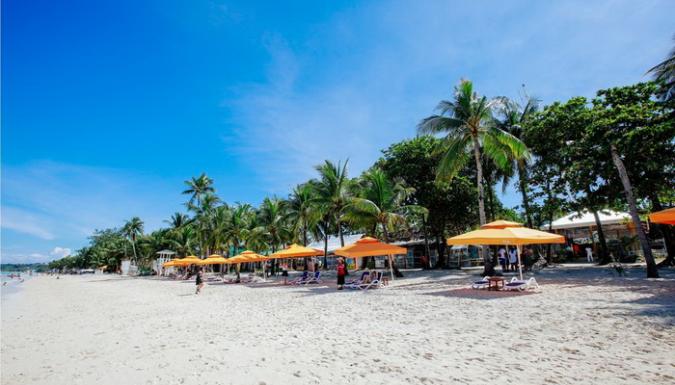 - На берегу много зелени/пальм, которые усыпаны кокосами