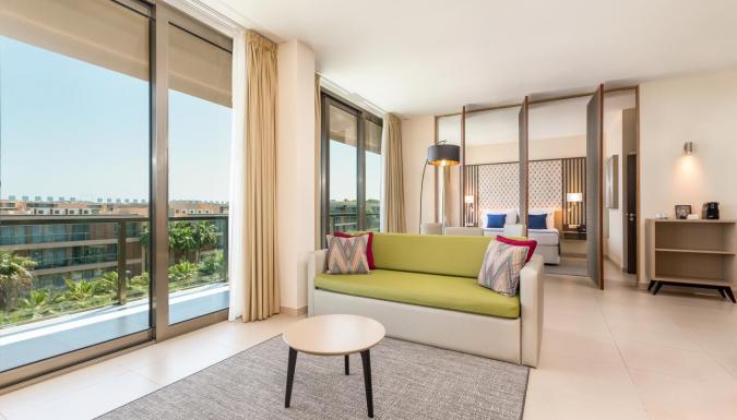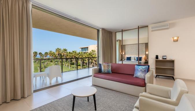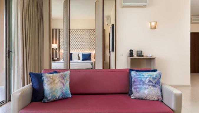 Услуги и удобства: балкон, телефон, спутниковые каналы, кабельные каналы, телевизор с плоским экраном, сейф, кондиционер, гладильные принадлежности, гостиный уголок, отопление, звукоизоляция, плиточный/мраморный пол, шкаф или гардероб, диван-кровать, кофеварка/чайник, мини-бар, обеденный уголок, кофемашина, услуга «звонок-будильник», белье.