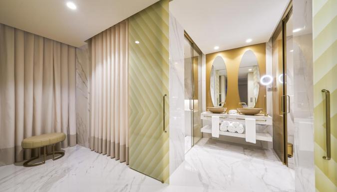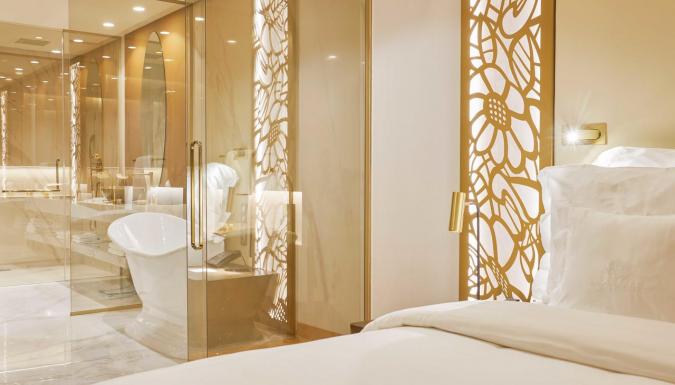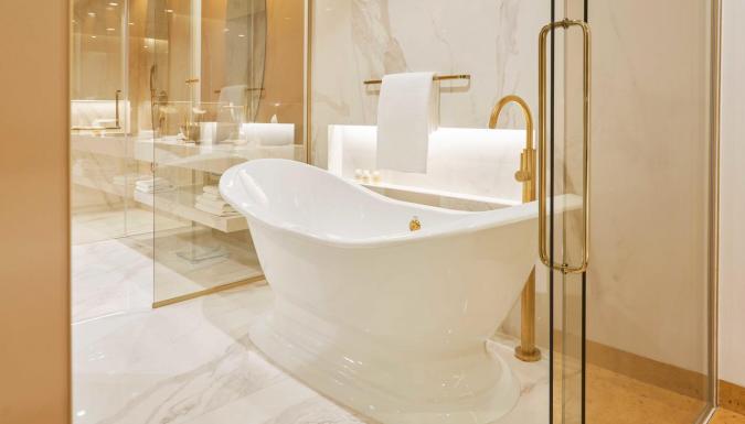 - Просторная ванна, которую отделяет от номера прозрачная стенка со шторкой