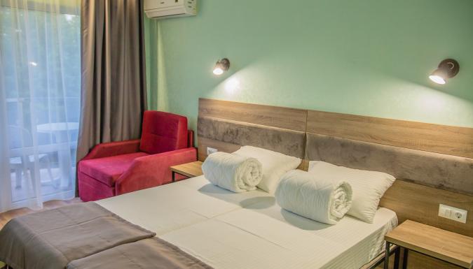 В каждом номере: холодильник, телевизор, телефон, Wi-Fi интернет, сплит-система, ванная комната (душ, туалет, раковина), балкон с летней мебелью или террасой.