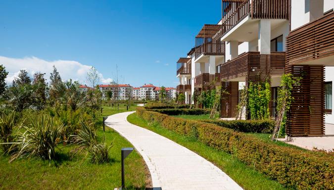 расположен в Адлере, в 500 метрах от берега Черного моря.Это самое зеленое место всего гостиничного комплекса «Имеретинский». Семейные номера. Просторные апартаменты имеют современный стильный интерьер. Уютные внутренние дворы с бассейнами, местами для отдыха, детскими и спортивными площадками граничат с природными озерами. Собственный оборудованный пляж находится в 800 метрах, каждый час туда курсирует бесплатный трансфер.