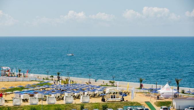 - 1 км (насыпной песчаный пляж, вход в море - галька)