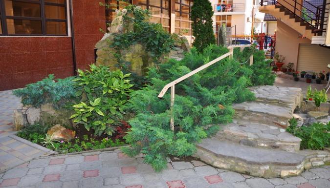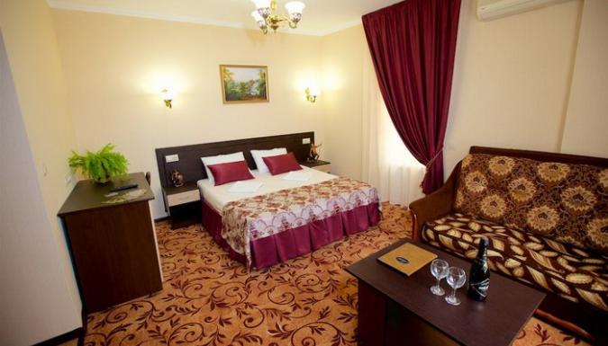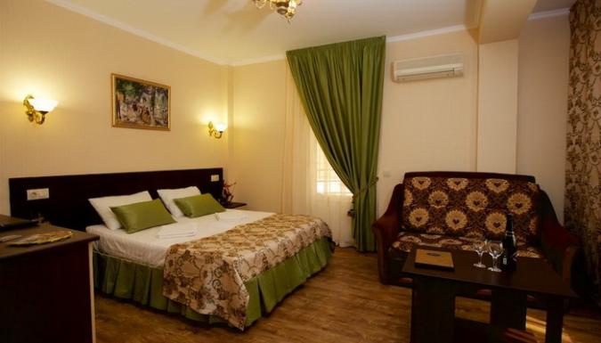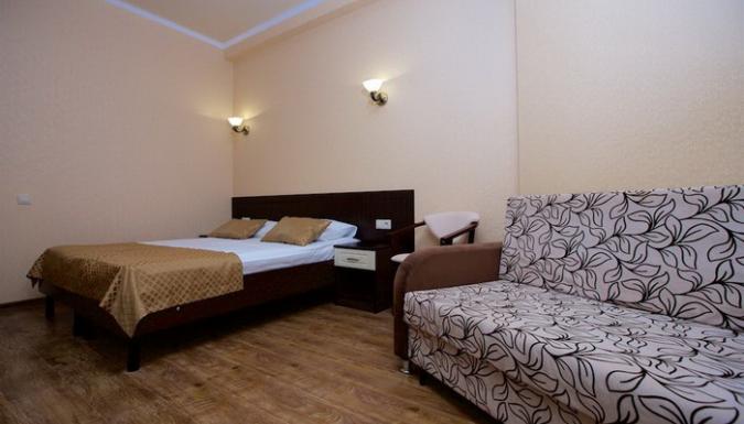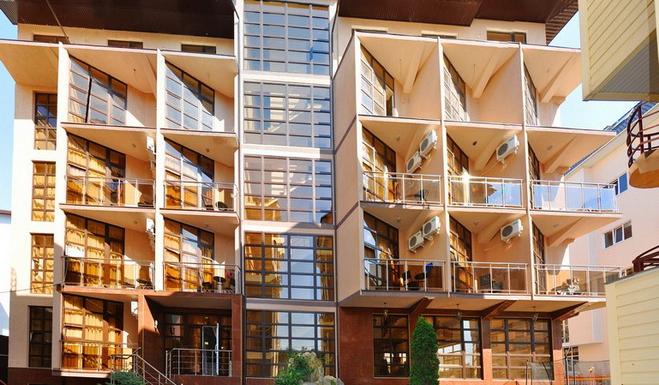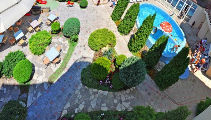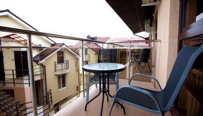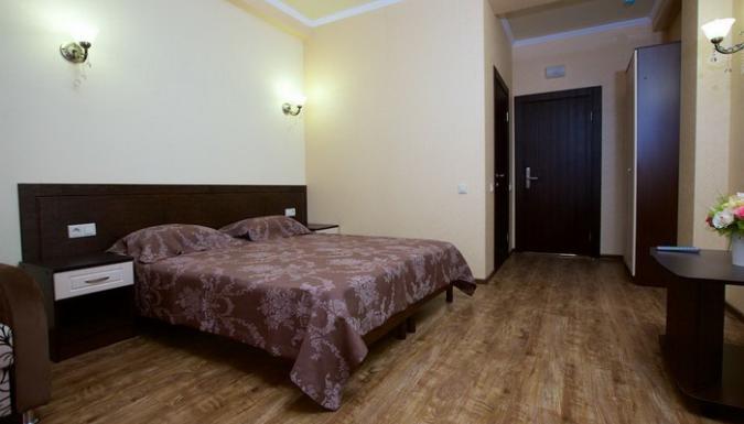Гостевой дом представлен двумя пятиэтажными корпусами с комфортабельными номерами. В каждом из них насчитывается по 16 номеров. Количество мест в отеле – 64. Для размещения приехавших туристов предлагаются двухместные номера класса «стандарт», «стандарт-мансарда». Площадь каждого номера составляет девятнадцать квадратных метров. В каждом номере находится санузел полной комплектации, спутниковое телевидение, система климат-контроль, функциональная мебель и холодильник. Внутренний двор гостевого дома полностью благоустроен. На парковой территории встречаются альпийские горы с фонтанами, цветники, оборудованные детские площадки, все необходимые аксессуары для приготовления барбекю и шашлыка, открытый бассейн с постоянным подогревом и гидромассажем, который выполнен в виде падающего водопада. В работающем кафе каждый турист может заказать себе комплексное трехразовое питание или исключительно завтрак, рядом работает бар. Для отдыхающих на личном транспорте предоставляется место на парковке. Вся территория гостевого дома круглосуточно охраняется.