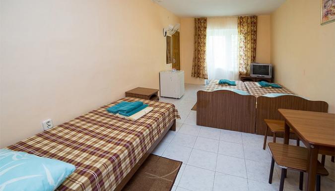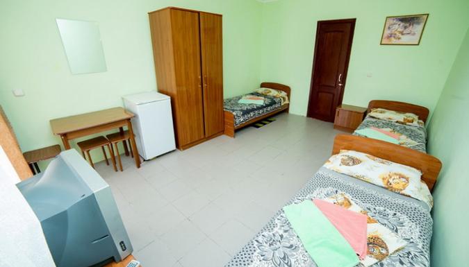 3-местный стандартный номер (макс. 3+1 чел., 15-17 кв. м, телевизор, вентилятор, душ, умывальник, холодильник, туалет, три 1-спальные кровати). Доп. место - раскладушка, может быть установлена без ограничения по возрасту.