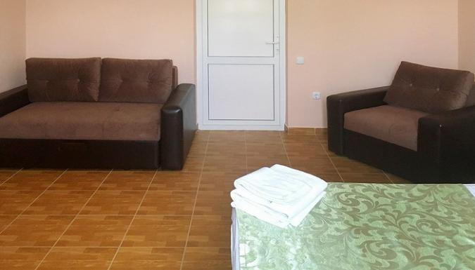 4-местный 2-комнатный 2-уровневые апартаменты (макс. 4+1 чел., телевизор, душ, холодильник, 1-спальные/ 2-спальная кровать, раковина, туалет, кухня, кондиционер на 2-ом этаже, на 2-ом этаже - второй санузел (без душа)). Доп. место - раскладной диван, может быть установлены без ограничения по возрасту. по согласованию с администрацией пансионата возможно установка второго дополнительного места..