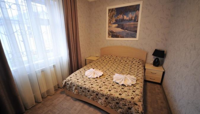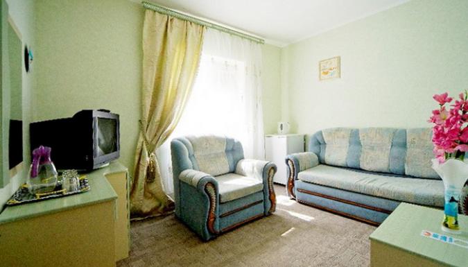 3-местный 2-комнатный люкс (макс. 3+2 чел., 28 кв. м, телевизор, кондиционер, душ, холодильник, 2-спальная кровать, туалет). Доп. место - еврораскладушка, может быть установлена для детей до 12 лет.