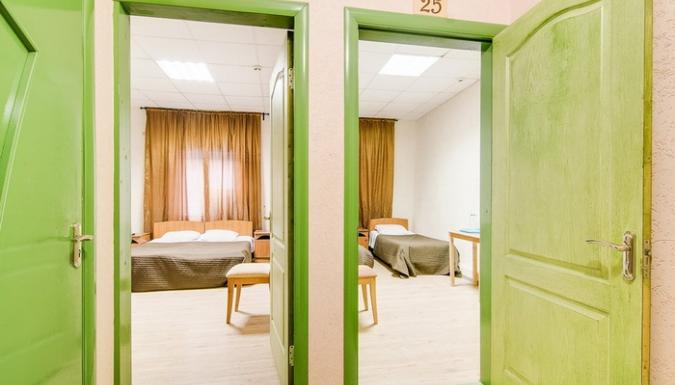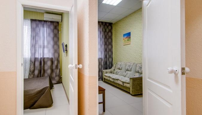 4-местный 2-комнатный семейный (макс. 4 чел., 25 кв. м, телевизор, кондиционер, холодильник, 1-спальные/ 2-спальная кровать, прикроватные тумбочки, стулья, ванная комната, Самый выгодный вариант для проживания очень большой семьи, в номере может смело разместиться до 5 человек. Также идеально подходит для размещения двух семей. Комнаты разделены межкомнатной дверью, один санузел и ванная. ).