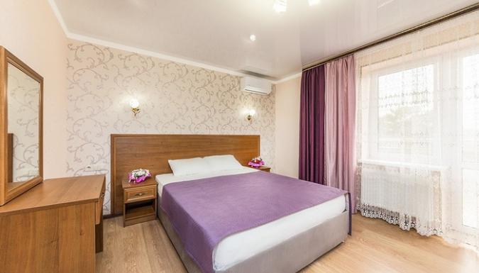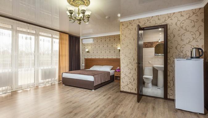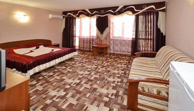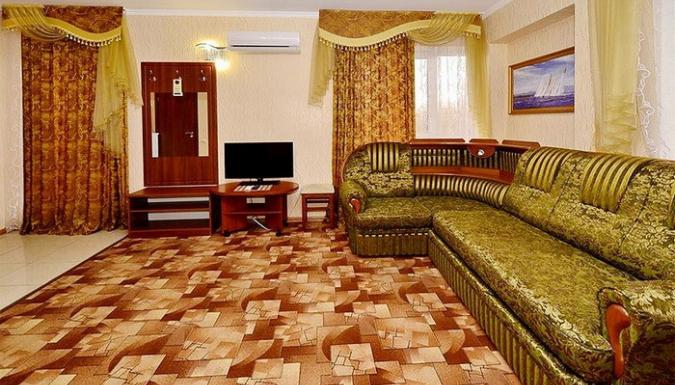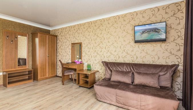 2-местный 2-комнатный люкс (макс. 2+2 чел., 50 кв. м, телевизор, сплит-система, ванна, фен, тапочки, холодильник, 1-спальные/ 2-спальная кровать, туалет). Доп. место - раскладной 2-спальный диван, может быть установлен без ограничения по возрасту..