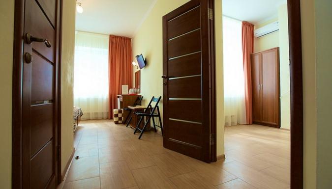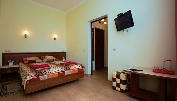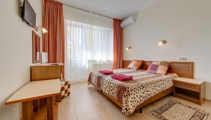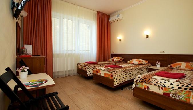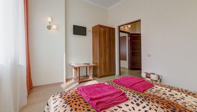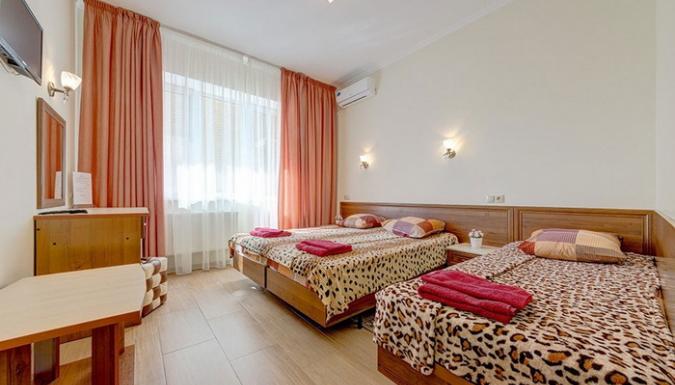 4-местный 2-комнатный стандарт (макс. 4+2 чел., Wi-Fi, телевизор, сплит-система, ванна, фен, холодильник, балкон, электрочайник, сейф, 1-спальные/ 2-спальная кровать, санузел, посуда (графин, стаканы), номера есть с раздельными комнатами и смежными ). Доп. место - еврораскладушка, может быть установлена без ограничения по возрасту.