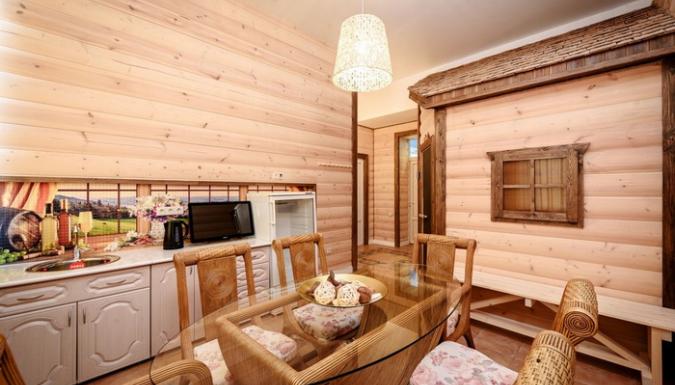 4-местный стандарт в деревянном корпусе (макс. 4+1 чел., 27-32 кв. м, телевизор, сплит-система, душ, фен, холодильник, журнальный столик, шкаф, санузел, в качестве основных мест предоставляется 2-спальная кровать и две 1-спальные). Доп. место - кресло, или еврораскладушка, может быть установлена без ограничения по возрасту.