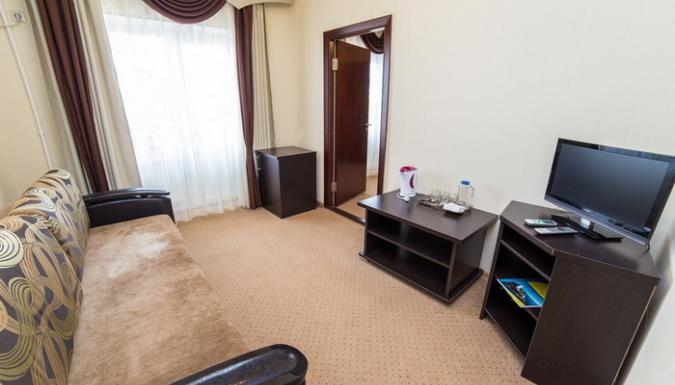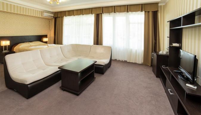 2-местный 2-комнатный люкс (макс. 2+2 чел., 35 кв. м, телевизор, сплит-система, душ/ванна, умывальник, фен, халаты, холодильник, балкон, 2-спальная кровать, туалет). Доп. место - диван, может быть установлен без ограничения по возрасту.