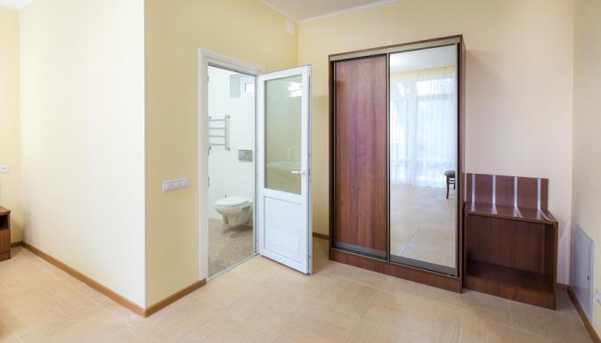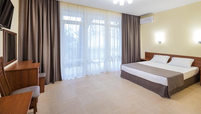 В номере: двухспальняя кровать, телевизор, 2 тумбочки, журнальный столик, два стула, cтол с зеркалом, пуфик, шкаф с зеркалом, чемоданница.