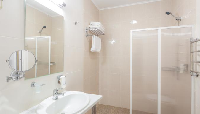 Сан узел 4.5 м2. Душевой поддон, зеркало, фен, жидкое мыло + шампунь.