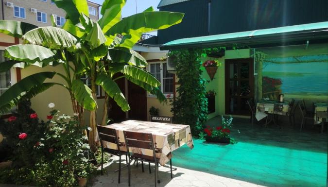 Гостевой дом имеет озеленённую дворовую территорию, которая оборудована столиками для отдыха, есть бассейн 8х4м, мангал для приготовления шашлыка, теннисный стол. Во дворе имеются бесплатные парковочные места для автомобилей.