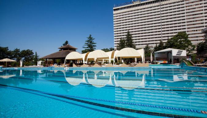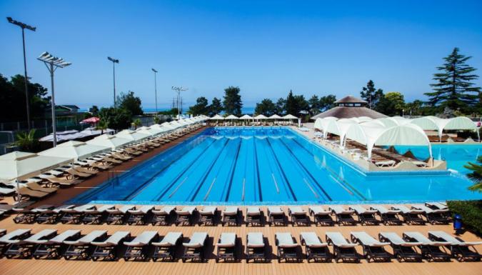 открытый бассейн с подогреваемой морской водой (+27 С) длиной 50 метров, на 8 дорожек, глубина — от 1.80 до 4.70 м