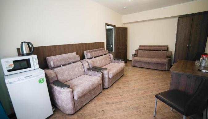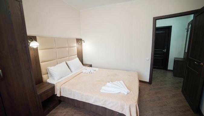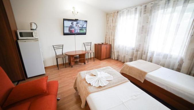 Двуспальная или две раздельные кровати, Телевизор, Кондиционер, Электрочайник, СВЧ, Сейф, Санузел (душ/ванна, умывальник, туалет, фен)