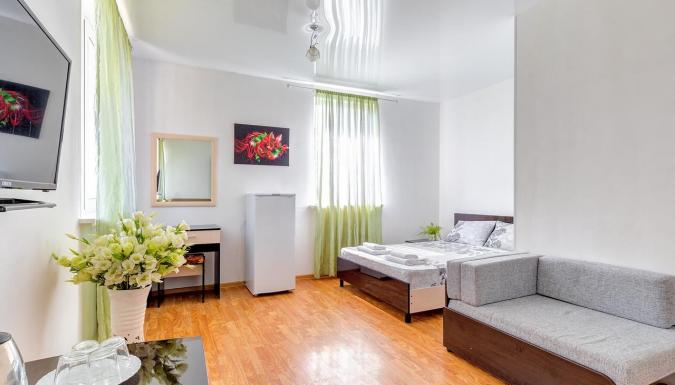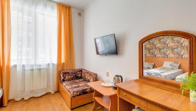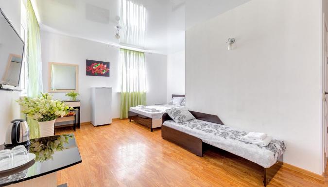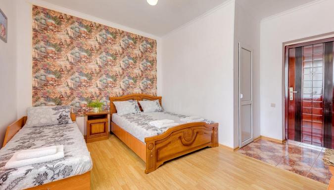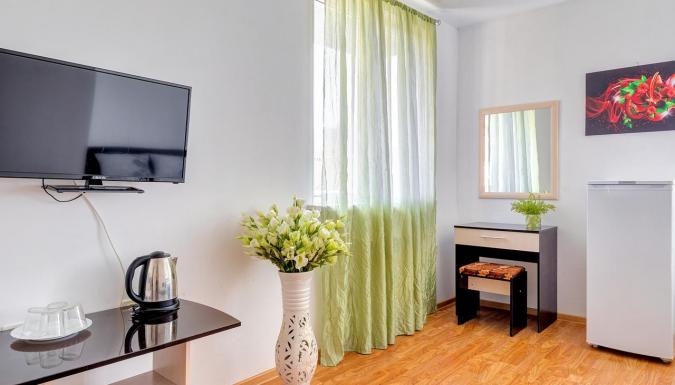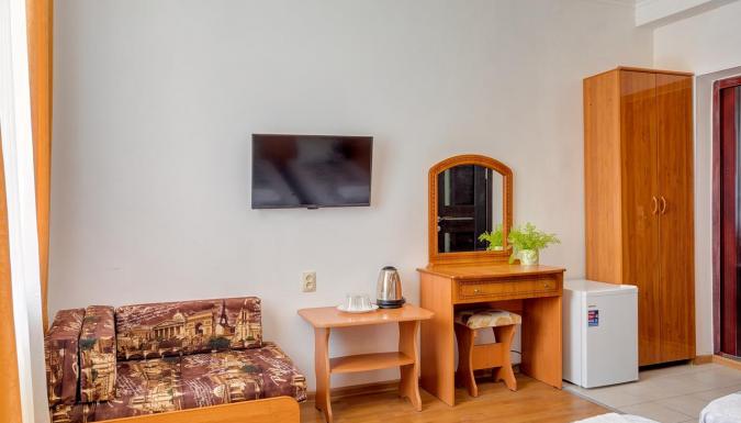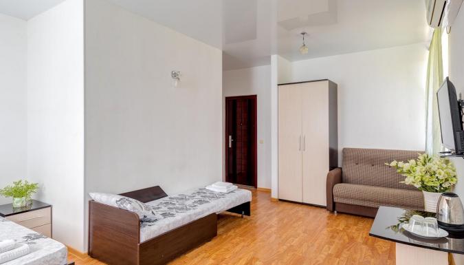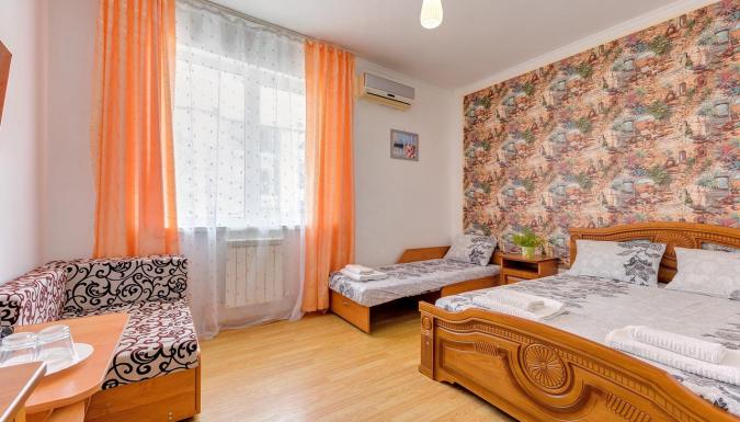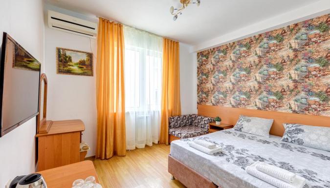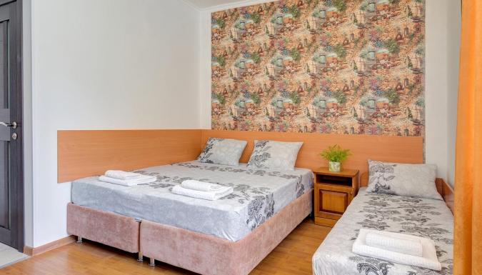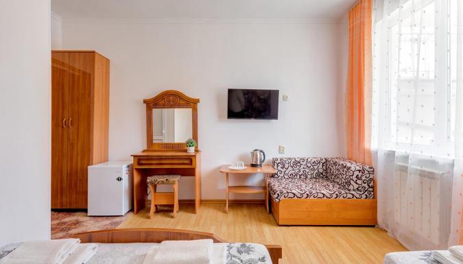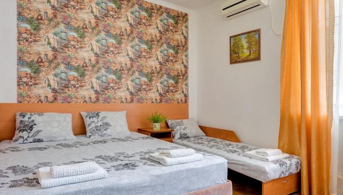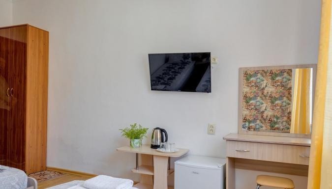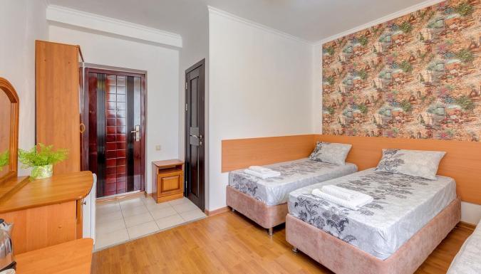 Гостевой Дом оснащен разнообразным номерным фондом: номера класса стандарт, улучшенный стандарт, семейные апартаменты с мини-кухнями вместительность от 2-х до 6-ти человек – каждый гость может выбрать размещение по своим потребностям и бюджету. По-домашнему уютные номера оформлены в простом стиле и оснащены телевизорами, сплит-системами, мини-холодильниками, собственными ванными комнатами, а в некоторых номерах есть мини-кухни. Собственное водоснабжение (нет перебоев с водой). В стандартных номерах удобные кровати, санузел с душевой, раковиной и унитазом, кресло — кровать, сплит — система, мини-холодильник, ТВ, прикроватные тумбы и светильники, шкаф, зеркало, стол, стул, чайник, полотенца, мыльные принадлежности