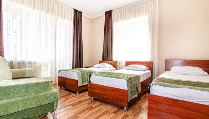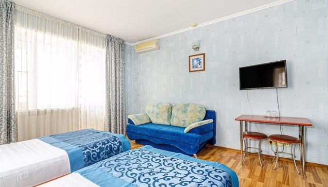 Трехместный номер со всеми удобствами: туалет, умывальник, душ, телевизор, холодильник, кондиционер, фен. Основные места кровати. Возможно дополнительное место кресло-кровать. Площадь номера - 24 кв.м.