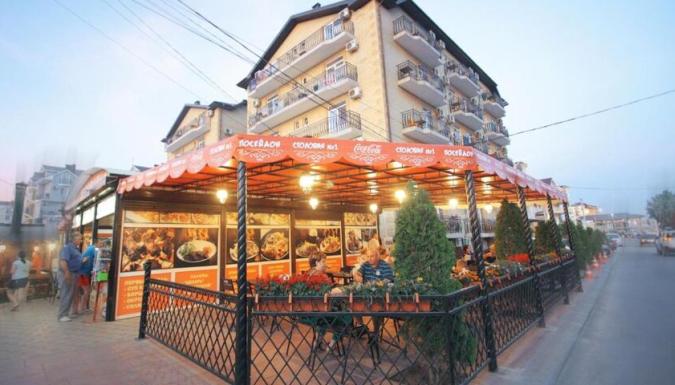 Также на территории отеля с 7 утра до 12 ночи работают столовая и бар с летней верандой, прилегающей к бассейну, предлагают гостям разнообразное, вкусное, недорогое питание, шашлыки, блюда на мангале, напитки.
