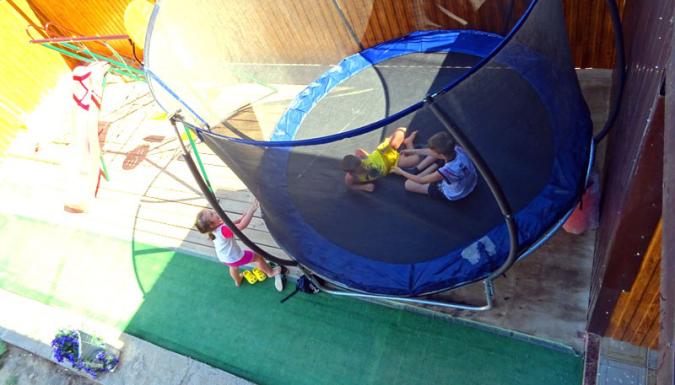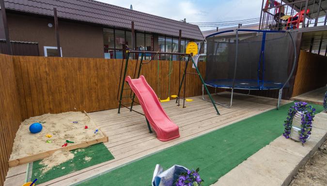 Для детей есть детская площадка, батут, качели, горка и песочница.