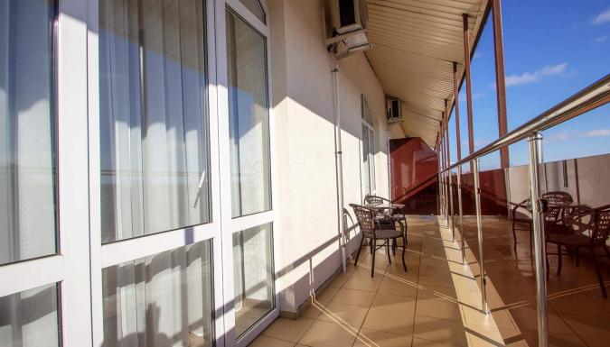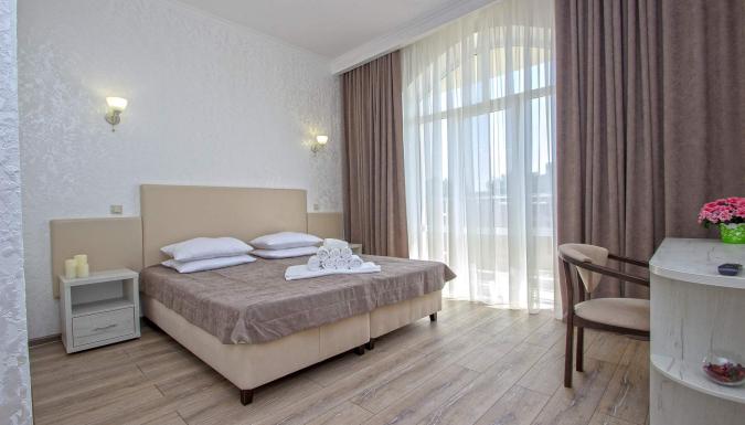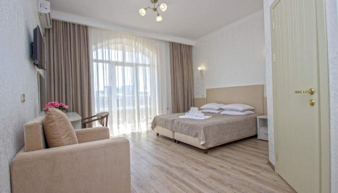 Номера оборудованы эргономичной мебелью, выполнен дизайнерский ремонт в спокойных светлых оттенках. В каждом из них есть телевизор, место для хранения вещей и собственная ванная комната,сейф,лоджия,холодильник, кондиционер. Кровать двухспальная или 2 односпальных. В каждом номере фен и чайник, ванные принадлежности.