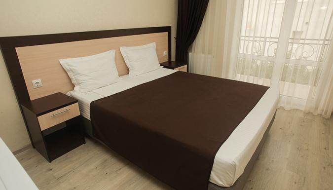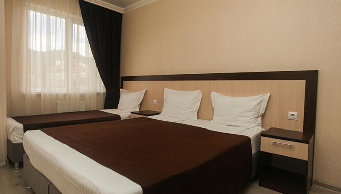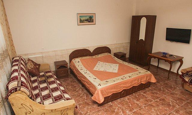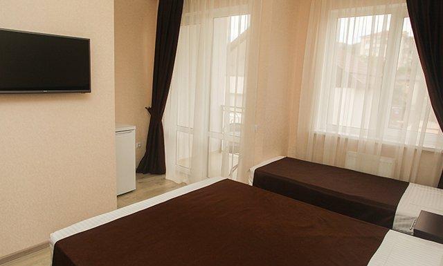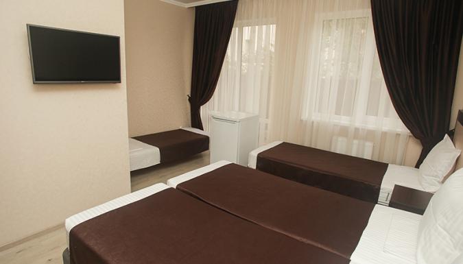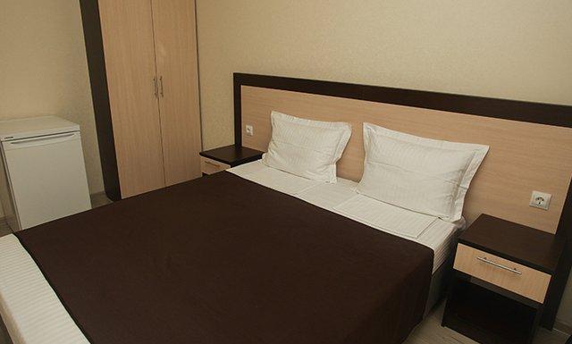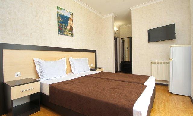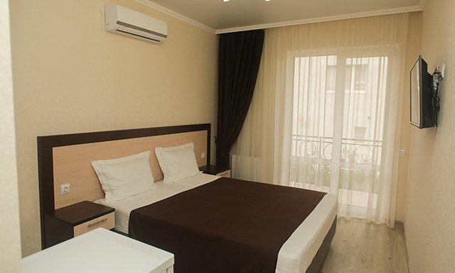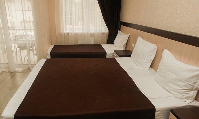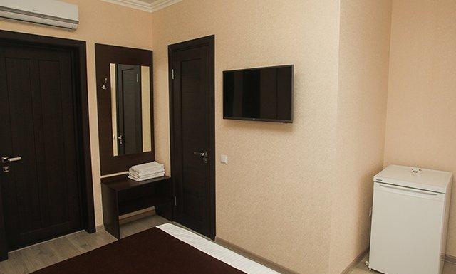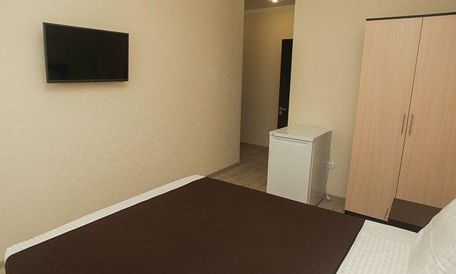 Стандарт: двуспальная кровать/2 односпальные кровати/двуспальная + односпальная кровати/4 односпальные кровати/двуспальная + 2 односпальные кровати, прикроватные тумбочки, шкаф, зеркало, вешалка, сплит-система, телевизор, холодильник, санузел с душем, балкон (не во всех номерах).