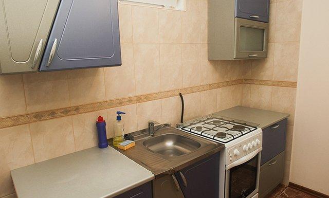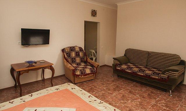 Студия: 2 односпальные кровати, прикроватные тумбочки, диван-кровать, кресло, журнальный столик, стулья, зеркало, шкаф, сплит-система, телевизор, кухня (газовая плита, микроволновка, посуда, холодильник), санузел с душем.