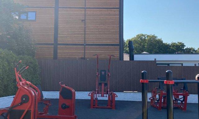 Открытый бассейн с постоянной температурой воды +28 градусов, тренажеры на открытой площадке