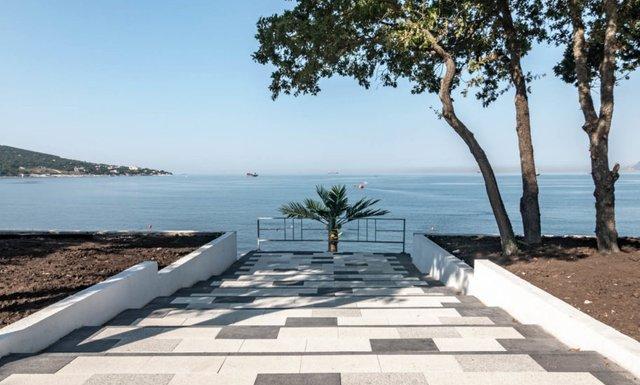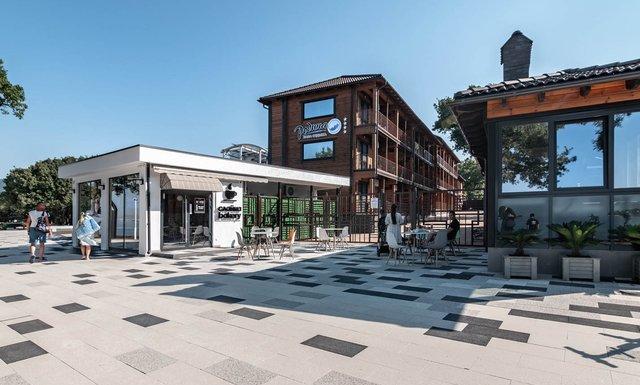 В непосредственной близости находится живописный галечный пляж, оборудованный всем необходимым для комфортного отдыха: есть и шезлонги, и зонтики от солнца, разнообразные водные аттракционы.