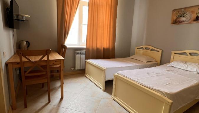 В номере: две раздельные кровати, комод, телевизор, холодильник, зеркало, банные полотенца.