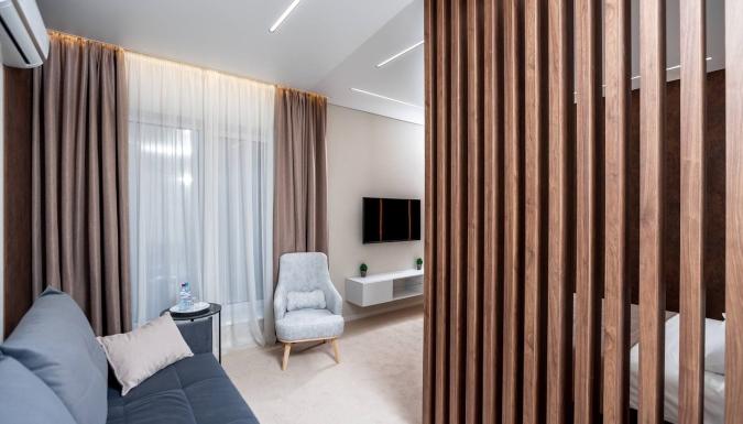 В 4-этажном здании пансионата могут одновременно отдыхать до 150 человек. Жилой фонд пансионата представлен просторными номерами 1 категории, категориями джуниор сюит и люкс. Во всех номерах имеются: набор мебели, телевизор, холодильник (мини-бар), телефон, кондиционер, фен, кабельное и спутниковое телевидение.