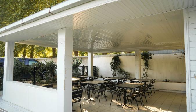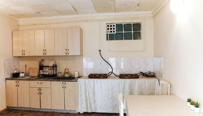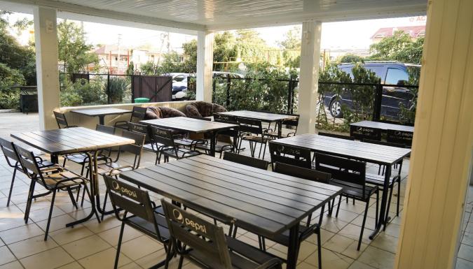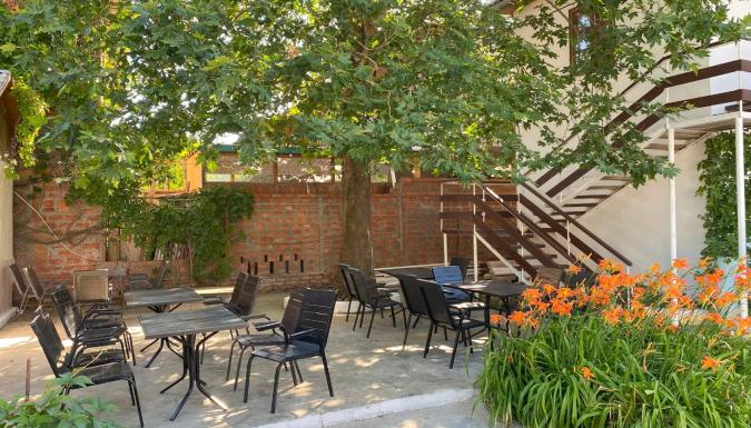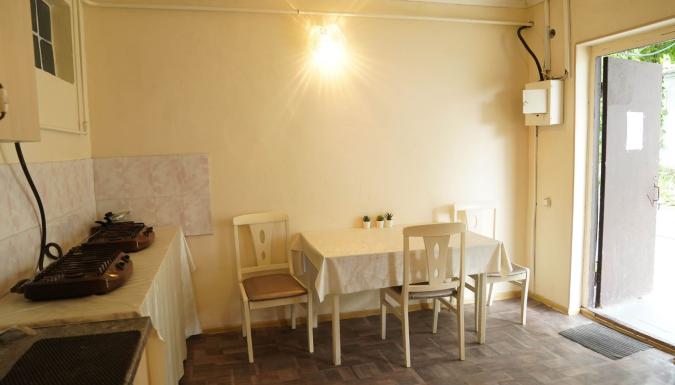 Есть общая кухня со всем необходимым с большой обеденной зоной, мангальная зона со столами под навесом.