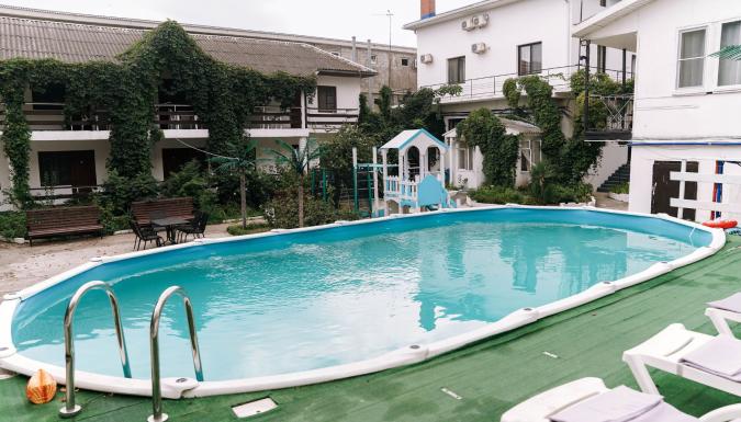 Закрытая благоустроенная территория с детской площадкой, подогреваемым бассейном, баром, местами для отдыха.