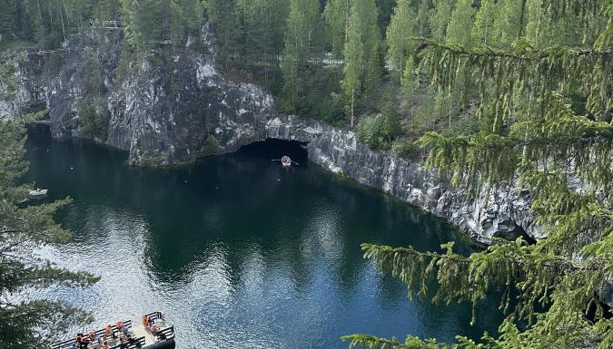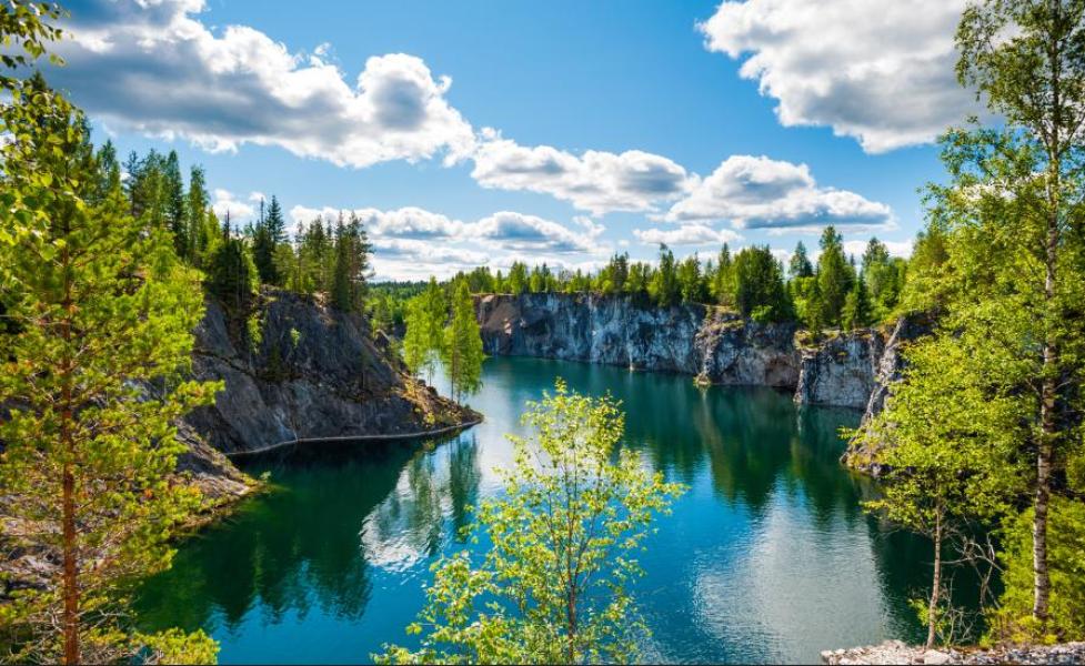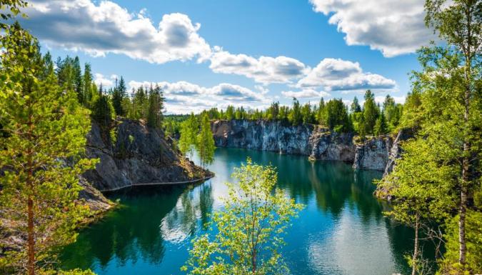 Первой остановкой по нашему маршруту будет горный парк Рускеала. Это уникальный памятник природы и горнодобывающей промышленности. Комплекс составляют рукотворные мраморные карьеры, скалы, подземные штольни и заброшенный мраморный завод, а центром и главной достопримечательностью парка является Мраморный каньон.