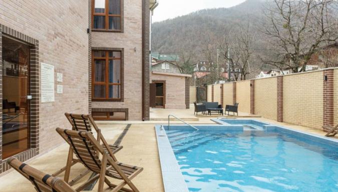Отель в поселке Эстосадок курорта Красная поляна. Шикарный вид, удобное расположение, высокий уровень комфорта, открытый подогреваемый бассейн, спа-зона. В горнолыжный сезон действует бесплатный трансфер до подъемников.