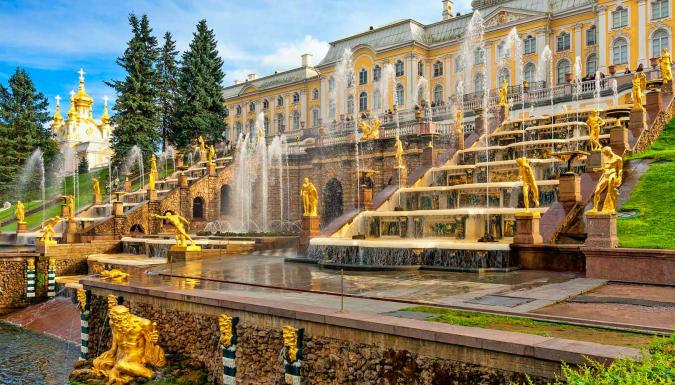 Петергоф — дворцово-парковый ансамбль с многочисленными фонтанами и статуями античных богов, покрытых золотом. Кстати, вся вода из фонтанов идет самотеком без использования насосов.