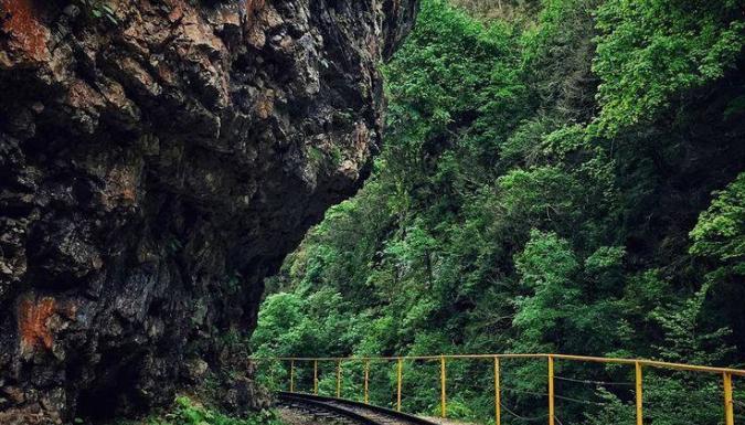 Экскурсия в Гуамское ущелье (доп. плата 1000 росс. руб). Имея длину 3 км и глубину 400 м, ущелье сужается местами до 2 м. Это гигантская каменная щель, сильноизломанная в плане. Неиссякаемое восхищение вызывают обнажения горных пород по сторонам реки и многочисленные небольшие водопады, срывающиеся с отвесных скал. Также вас ожидает поездка по Гуамскому ущелью на раритетном поезде по узкоколейной железной дороге, извилистой лентой проложенной под скалами.